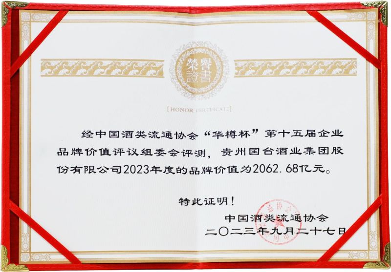 胜马财经获悉,常年以来,国台无论从销售规模、品牌价值、纳税额等方面,综合实力都稳居贵州白酒第三。最新权威数据显示:2023年9月,经中国酒类流通协会“华樽杯”第十五届企业品牌价值评议组委会评测,国台以2062.68亿元的品牌价值,蝉联中国白酒第十名、贵州白酒第三名。