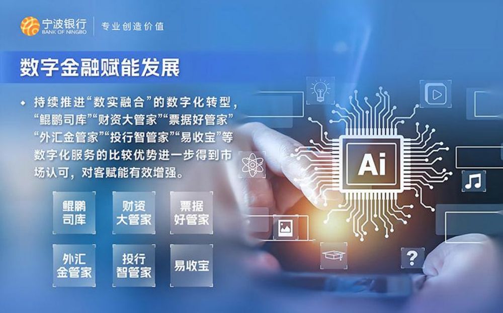 在数字金融领域,宁波银行紧跟数字中国战略步伐,通过智慧银行建设、开放银行实践以及数字化服务方案创新,将金融服务无缝嵌入客户数字生态中。宁波银行“鲲鹏司库”“财资大管家”等数字化服务产品的推出,进一步提升了客户的金融服务体验,为企业数字化转型提供了有力支持。